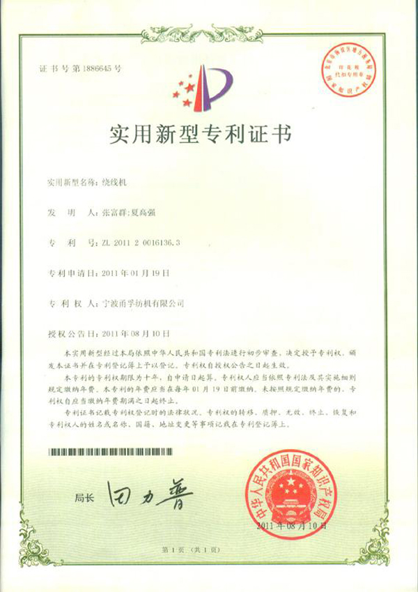 我公司自动跟踪上油绕线机获实用新型专利,证书号第1886645号